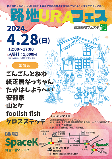 路地URAフェス 鎌倉路地フェスタ内で開催される音楽や紙芝居などパフォーマンスが繰り広げられる1日限りのライブフェスティバル!久しぶりに開催します!気持ちいい日差しが照らす、Space Kにて、素晴らしいパフォーマーが発信する音を、ゆったりほっこり楽しめる1日です。⚫︎スタート:12:00 / チャージ:1000円⚫︎出演:ごんごんとねわ / 紙芝居なっちゃん / たかはしようへい / 安倍家 / 山とケ / foolish fish / クロスステッチ 日程:4/28(日) 12:00〜17:00